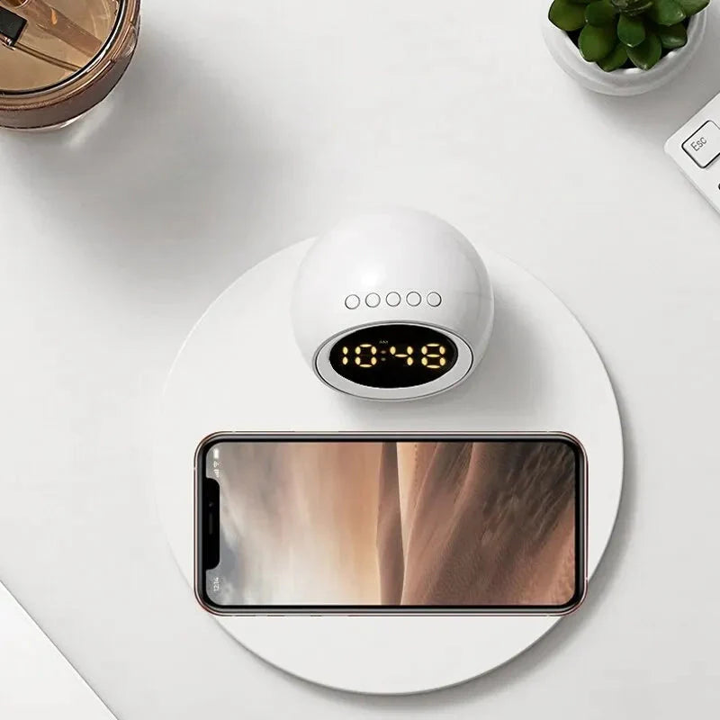 - Integroitu Langaton Laturi: Aseta puhelimesi kellon alustalle ja anna sen latautua yön yli ilman johtosotkua. Yhteensopiva kaikkien Qi-yhteensopivien puhelinten kanssa.