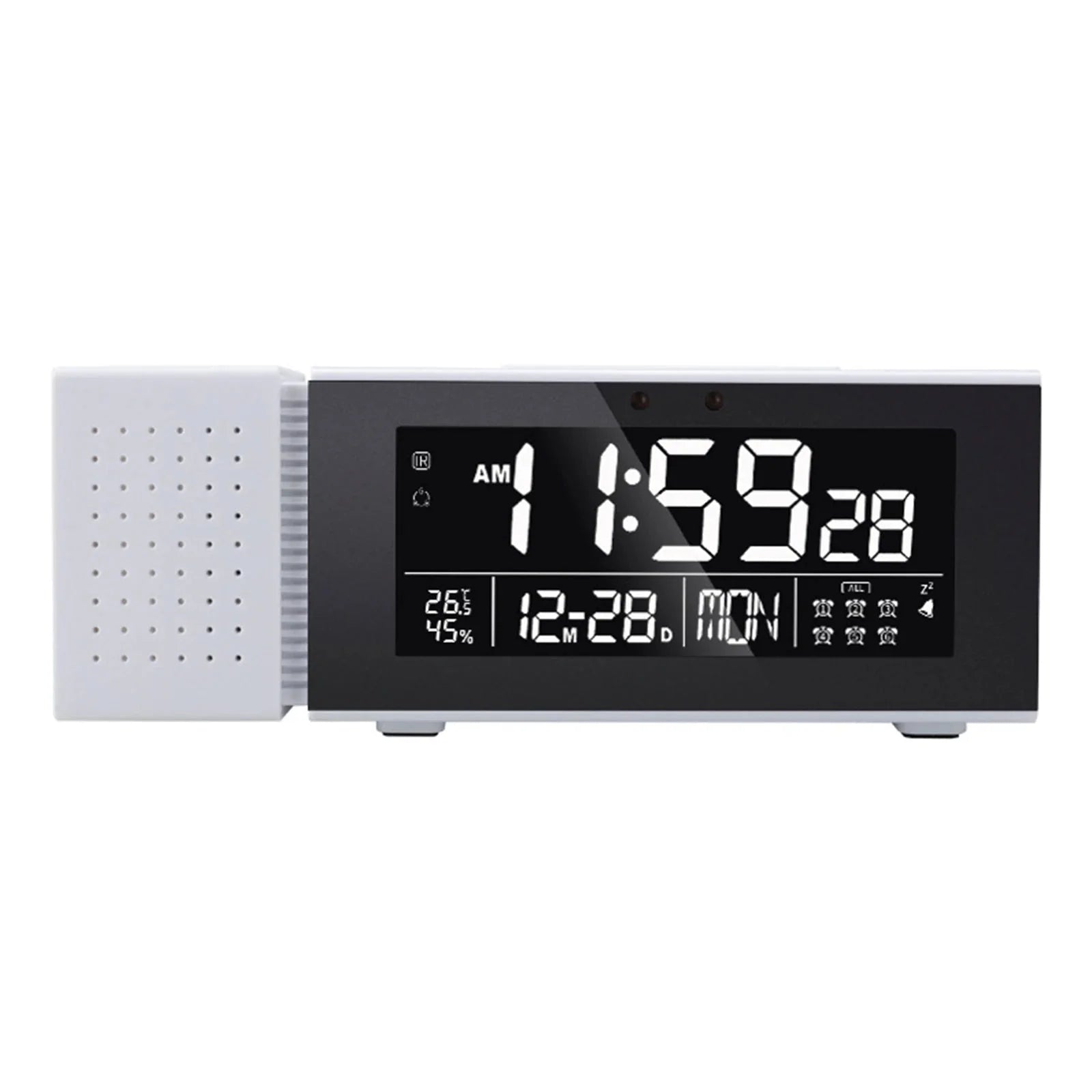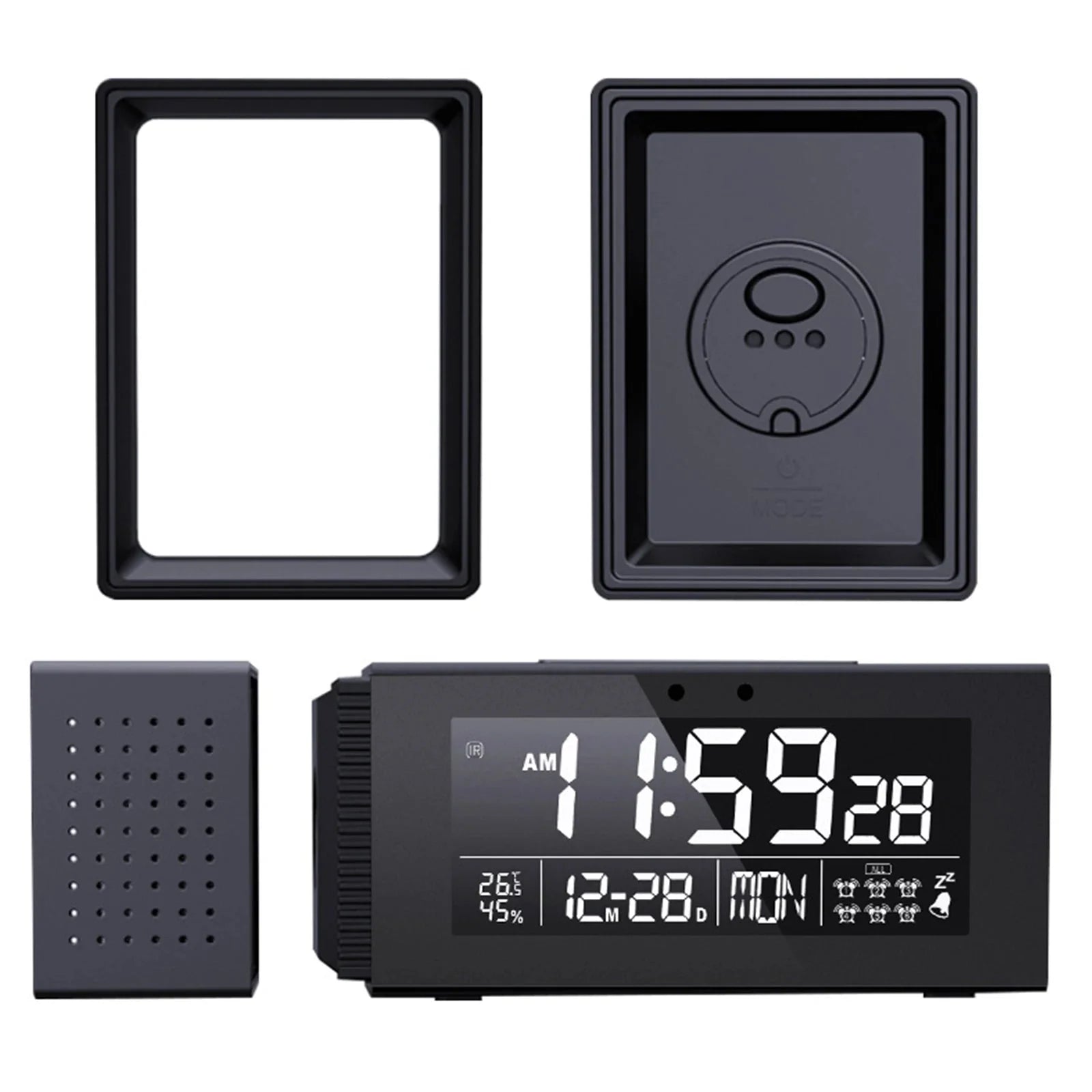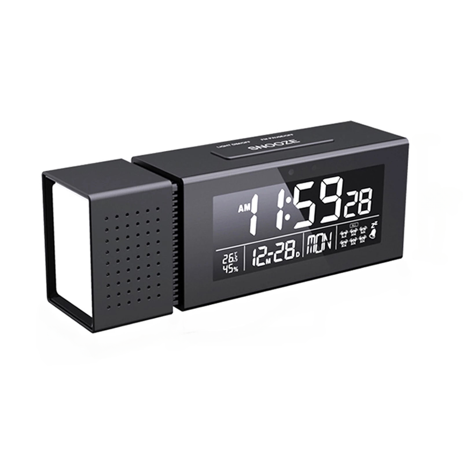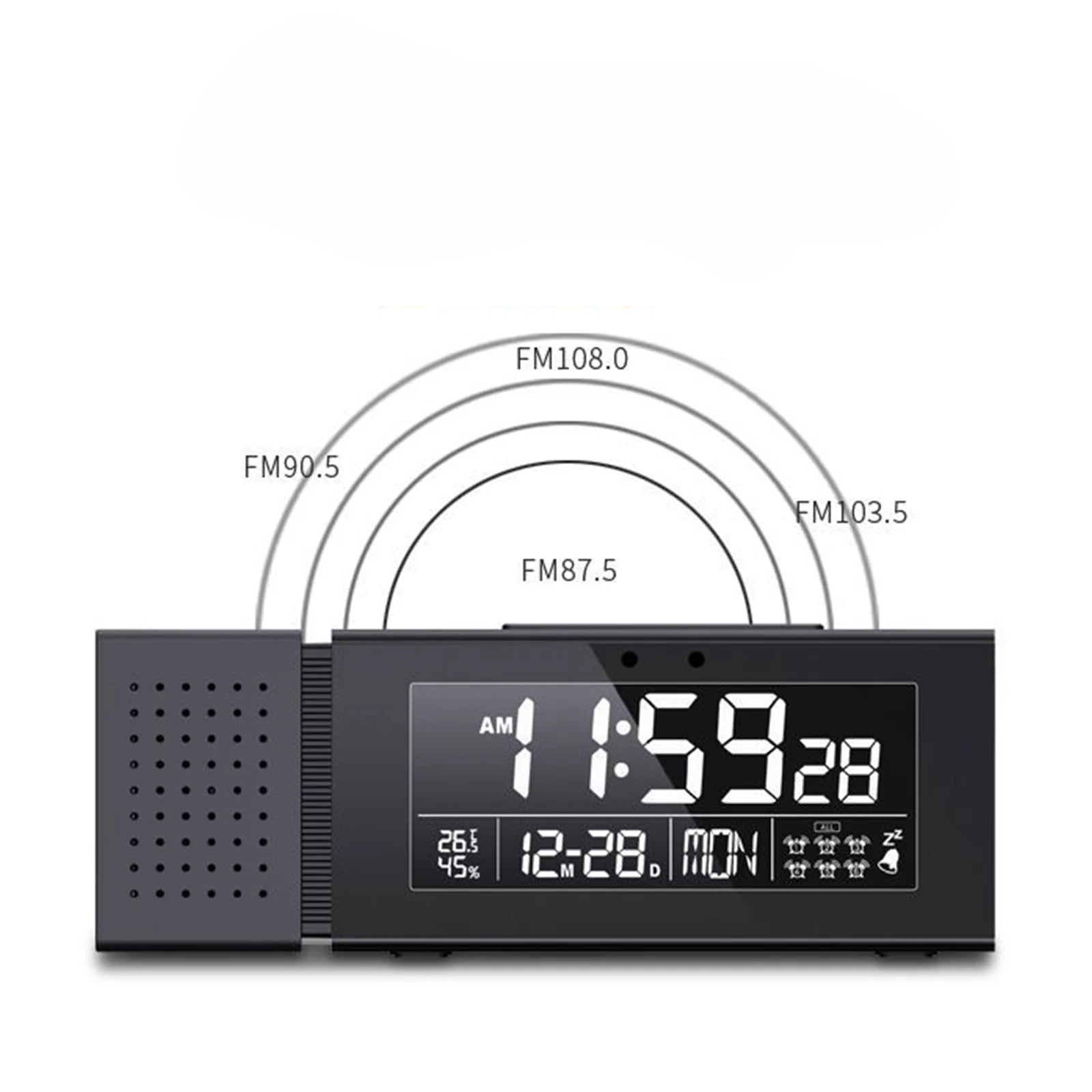 Tämä edistyksellinen digitaalinen kelloradio isolla valaistulla näytöllä tarjoaa paljon enemmän kuin pelkän ajanoton. Sen suuri, helposti luettava näyttö esittää kellonajan AM/PM-merkinnällä, tarkan päivämäärän (kuten 28. joulukuuta, maanantai), sekä huoneen lämpötilan (esim. 26.5°C) ja ilmankosteuden (esim. 45%). Nämä tiedot auttavat sinua suunnittelemaan päiväsi ja valitsemaan oikeat vaatteet mukavuutesi varmistamiseksi, olipa sitten kyseessä kylmä talvipäivä tai lämmin kesäaamu. Sisäänrakennettu kaiutin tarjoaa selkeän ja miellyttävän äänen herätykseen tai radion kuunteluun, luoden täydellisen äänimaiseman aamuihisi. Kuvan IR-symboli vihjaa myös helppokäyttöisyyteen ja mahdollisesti kauko-ohjausmahdollisuuteen, mikä tuo lisämukavuutta käyttöön. Se on kuin henkilökohtainen sääasema ja ajanottaja yöpöydälläsi.