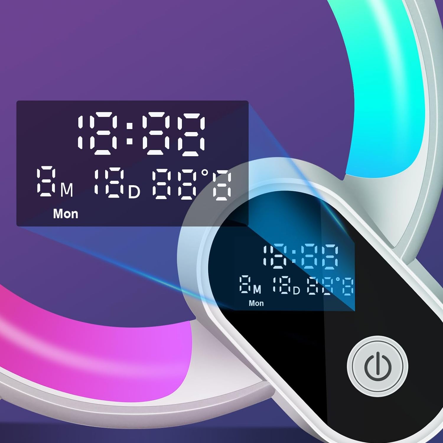 Tämä Herätysvalo luonnonäänillä ja auringonnousulla ei ole vain herätyskello, vaan se on myös tyylikäs sisustuselementti ja monipuolinen tunnelmavalaisin. Sen elegantti, pyöreä muotoilu integroidulla digitaalisella näytöllä tekee siitä katseenvangitsijan makuuhuoneeseesi. Voit käyttää sitä yövalona lapsille, lukulamppuna tai luoda viihtyisän tunnelman sen monivärisellä RGB-valolla, joka tarjoaa laajan valikoiman värejä jokaiseen mielialaan. Helppokäyttöisen käyttöliittymän ansiosta aika, päivämäärä ja jopa huoneen lämpötila (kuten näytöllä näkyvä 25°C) ovat aina selkeästi näkyvillä, tehden siitä täydellisen kumppanin makuuhuoneeseen.