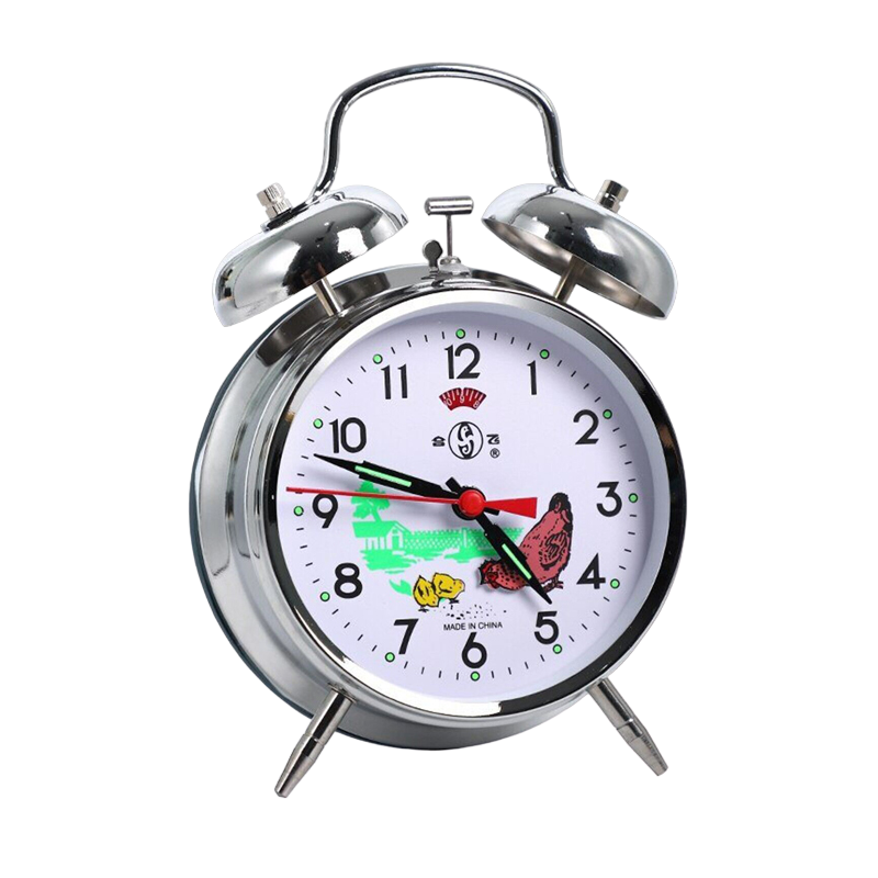 Tämä **Perinteinen mekaaninen kaksoiskello herätyskello** ei ole vain ajannäyttäjä, vaan myös hurmaava sisustuselementti. Sen kiiltävä kromipinta ja selkeä, valkoinen kellotaulu, jota koristavat iloiset kana- ja tipukuvat sekä pieni maalaistalo, tuovat maaseudun idylliä ja lämmintä tunnelmaa suoraan makuuhuoneeseesi. Numerot ovat isot ja helposti luettavat, ja vihreä sekä punainen osoitin tekevät kellonajan hahmottamisesta vaivatonta. Kellon tukevat jalat pitävät sen vakaasti pöydälläsi tai yöpöydälläsi, ja sen kestävä rakenne takaa pitkän käyttöiän. Anna tälle kellolle kunniapaikka kodissasi ja anna sen luoda retrohenkistä ja kutsuvaa ilmapiiriä. Se on täydellinen lahjaidea tai ihana lisä omaan kotiisi.