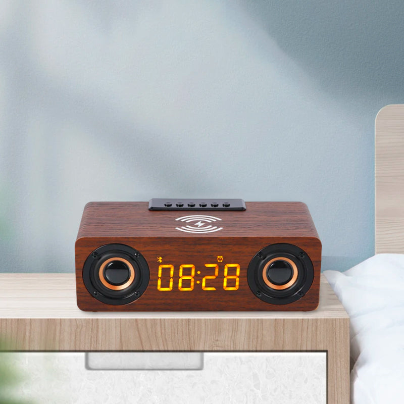 Tämä kaiutin ei ole pelkkä äänentoistolaite, se on kokemus. Sen upea, aidon puun tuntuinen ulkokuori kutsuu koskettamaan ja tuntuu ylelliseltä. Sisäänrakennetun Bluetooth-yhteyden ansiosta voit suoratoistaa musiikkia langattomasti mistä tahansa laitteesta – puhelimesta, tabletista tai tietokoneesta – ilman turhia johtoja. Digitaalinen kellonäyttö on selkeä ja helppolukuinen, ja herätyskellotoiminto takaa, että pysyt aikataulussa tyylillä. Se on suunniteltu moderniin elämäntyyliin, mutta kunnioittaa samalla menneiden aikojen estetiikkaa.