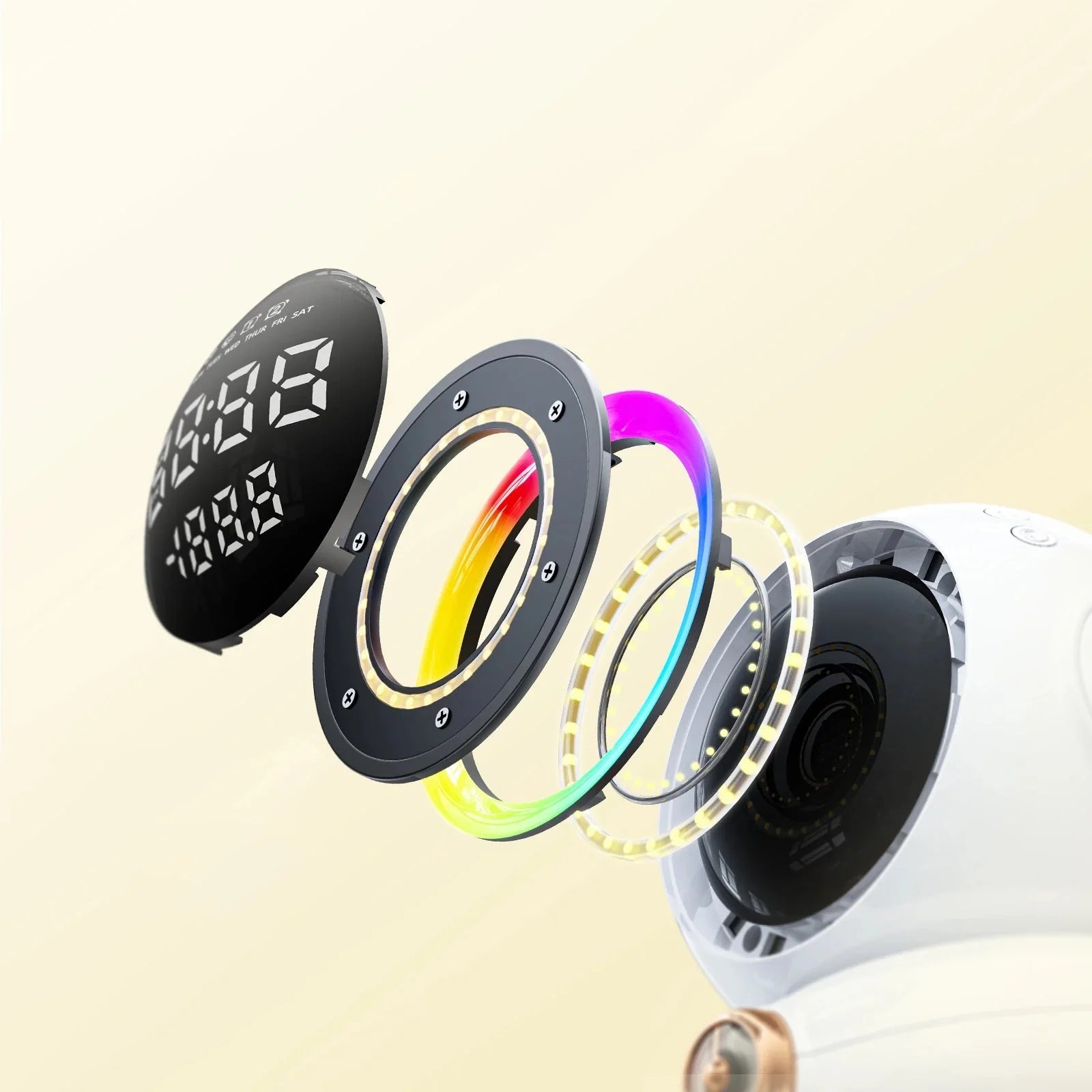 - Viileä Astronautti-Design: Valkoinen, pallomainen muotoilu ja kirkas näyttö tuovat futuristisen tunnelman suoraan avaruusaluksesta huoneeseesi.