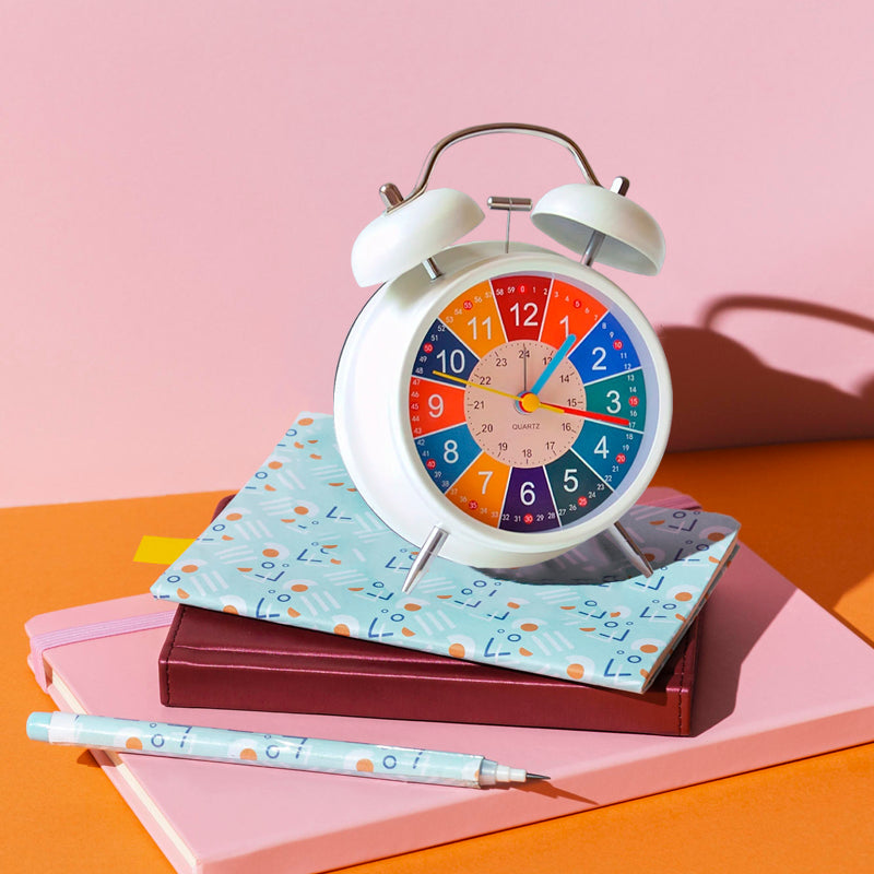 Tämä ainutlaatuinen herätyskello on suunniteltu erityisesti lasten tarpeisiin. Kellotaulun kirkkaat värit ja suuret numerot erottavat selkeästi jokaisen tunnin ja minuutin, tehden ajankohdan lukemisesta vaivatonta. Minuutit on numeroitu 0-59, ja tunnit 1-12 on täydennetty sisäpuolella olevilla 13-24 merkinnöillä, mikä tekee 24 tunnin kellonajan ymmärtämisestä lapselle todella selkeää ja vaivatonta. Se on ihanteellinen työkalu auttamaan lasta kehittämään ajantajuansa ja ymmärtämään, miten aika kuluu päivän aikana. Lisäksi perinteiset kaksoiskellot takaavat tehokkaan herätyksen, joten lapsi herää varmasti kouluun tai muihin tärkeisiin menoihin. Se on paitsi opettavainen, myös ilahduttava ja piristävä lisä jokaisen lapsen huoneen sisustukseen.